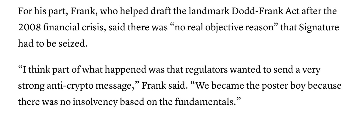 در این وضعیت هرکسی که درباره «فرار بانکی» و «سرایت» حرفی میزد بهانه کافی برای رگولاتورها بوجود میآمد تا آن را تعطیل کنند. همانطور که در CNBC نقل شده است، بارنی فرانک، معمار Dodd-Frank Act، گفت که توقیف Signature به طور بالقوه به دلیل انگیزه تنظیم کننده هایی بود که می خواستند “یک پیام بسیار قوی بر ضد کریپتو ارسال کنند … ما تبدیل به یک نمونه برجسته شدیم که بر اساس اصول ورشکستگی وجود نداشت.”