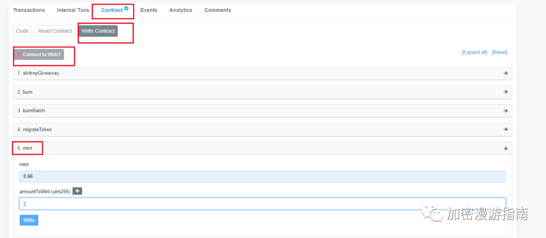 2.合约mint 【contract】-【write contract】-【connect to web3】-【mint】-【write】