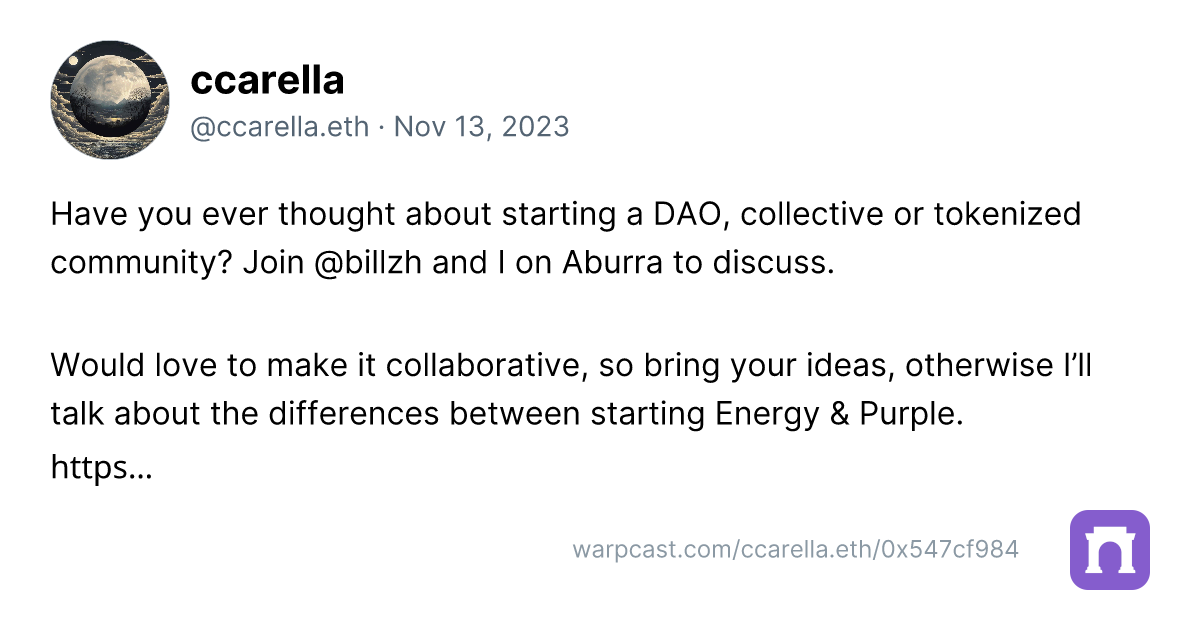 He also recently held a space on Aburra with Billzh, where they had a great discussion around topics related to founding a DAO and other types of tokenized communities. Check out the recording attached to the cast below.