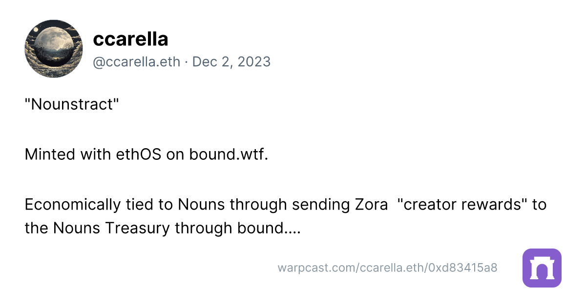 https://zora.co/collect/base:0xed5e62118f4f9d061a696e51b3df8fbd70f51870/1https://zora.co/collect/zora:0xdfc4bb739c92630a2af7102ed076448c0ca28287/3Bound.wtf is a new tool by wiz that lets users mint NFTs that accrue referral rewards back to the Nouns DAO treasury. Check out some mints using the tool from users in the Builderverse below. Could this be a useful tool to build for Builder DAO and integrate into drops.wtf? 👀