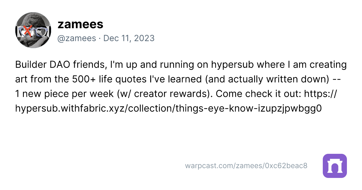 https://zora.co/collect/base:0x0193b7329714b7b5a2dabcbb6038ef3ce20aeb54/1https://zora.co/collect/zora:0xe69a4e2eca5a505f729f122fde8e49d18e534623/4https://zora.co/collect/zora:0x7f4a7966f01629f686a33526f37fe9e3eddc6c1e/1Builder member zamees has begun releasing a new piece per week on hypersub. You can subscribe here and read the full article detailing the launch here.