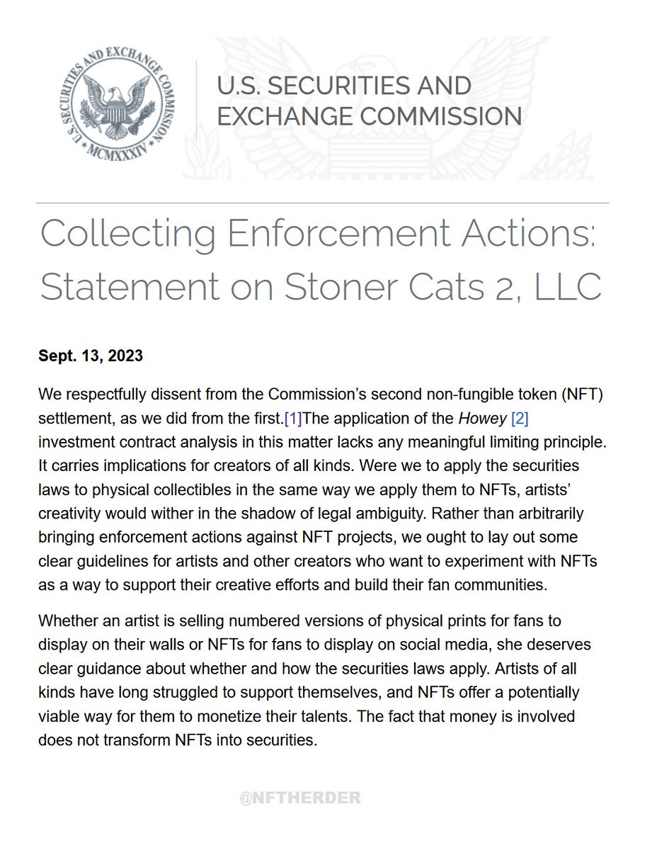•SEC commissioners Peirce and Uyeda just released a statement saying they DISAGREE with the SEC's actions against Stoner Cats nfts - @NFTherder