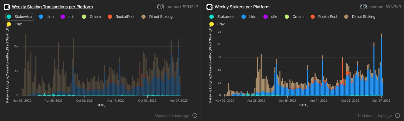 ![At the beginning of 2022, there was a sharp decline in the amount of ETH being staked. The number of stakes, however, has been slowly increasing since that first decline, indicating that people are once again interested in and confident in the Ethereum network. Frax ETH is one significant newcomer to the market for liquid derivatives staking. It has been claiming between 2% and 20% of the market share since the end of October 2022, significantly diversified the LSD market.