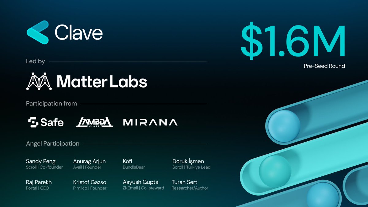 Clave 目前已完成 160 万美元预种子轮融资,由 Matter Labs 领投,Safe、Lambda Class、Mirana Ventures 以及 Scroll 的天使投资人 Sandy Peng、Portal 的天使投资人 Raj Parekh、Avail 的天使投资人 Anurag Arjun 等参投。
