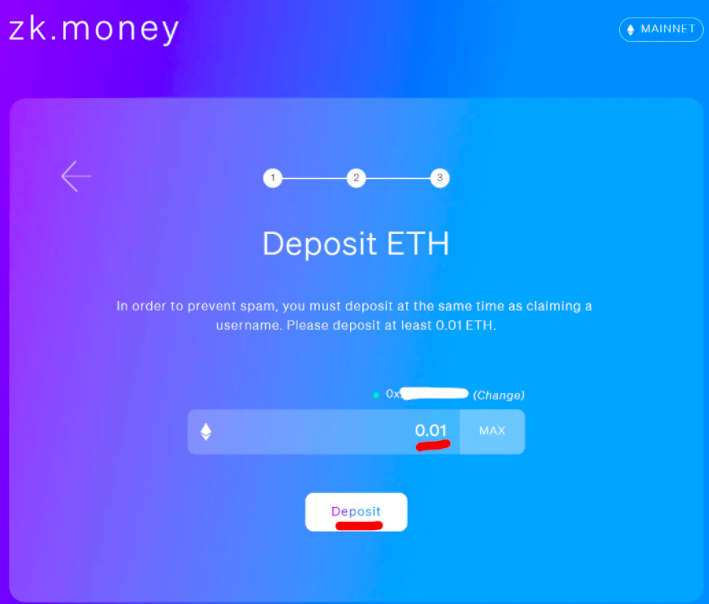 我们将致力于以太坊主网。在开始之前,请确保您的以太坊主网地址上有 $ETH。开设 zk.money 账户的最低存款需要 0.01 美元,并且需要一些 ETH 来支付 gas 费用(<0.01 美元)。