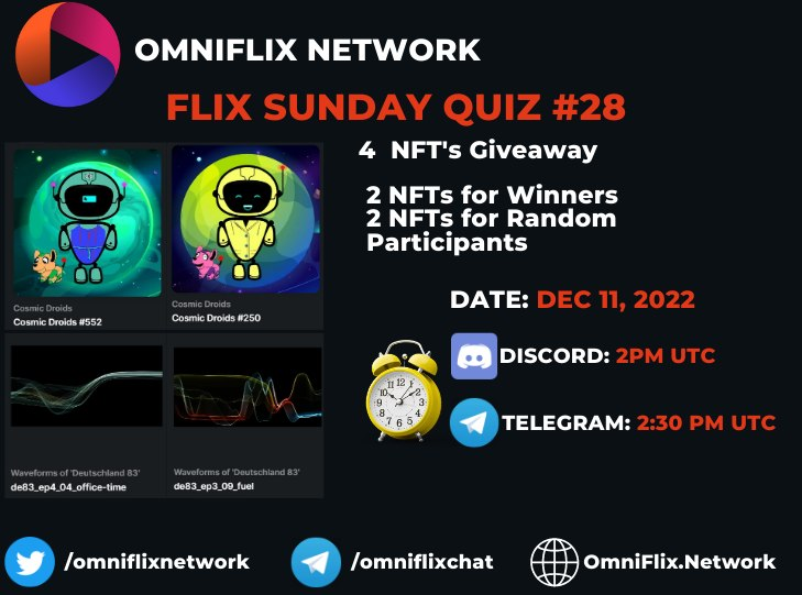 Join us for a fun quiz session every Sunday on OmniFlix Network Discord(2pm UTC) & OmniFlix Network Telegram (2:30 pm UTC).