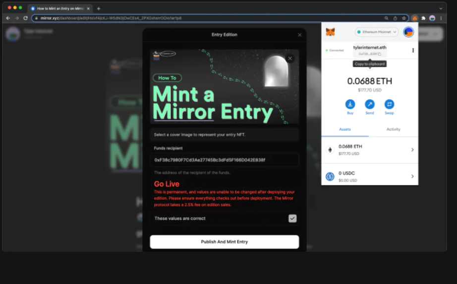 第五步:存成NFT,右上角点击Publish后,务必要点选:Mint as NFT Edition,然后点击Publish Entry后,然后选题图。输入你的钱包地址方便别人打赏,最后点选:These Values are correct,都完成后点击:Publish and mint Entry