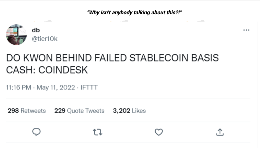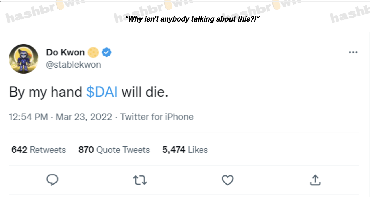 ![Source: Twitter // https://twitter.com/stablekwon/status/1506494471873081352?lang=en Did you know that just a couple of months after the co-founder of Terraform Labs tweeted this controversial tweet about [DAI], its own Stablecoin [UST] collapsed?
