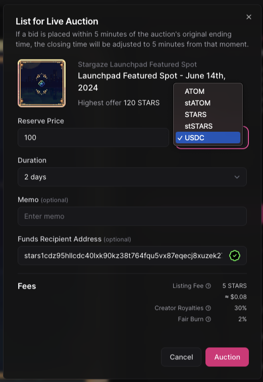 Stargaze now supports multi-asset auction functionality