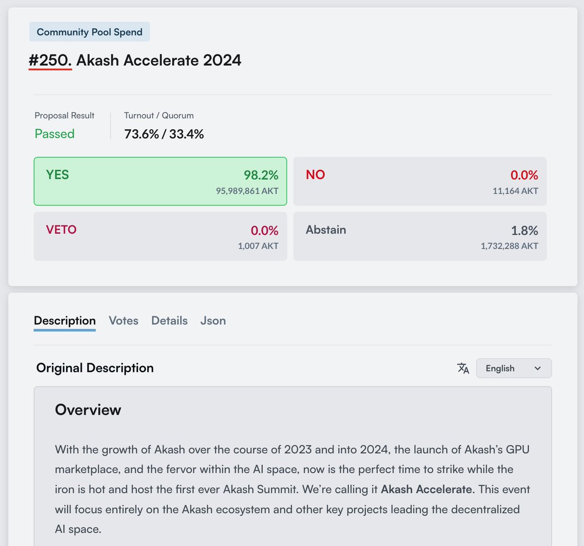 Akash Accelerate proposal passes, starting the process of the first Akash ecosystem public event going live in Austin, TX