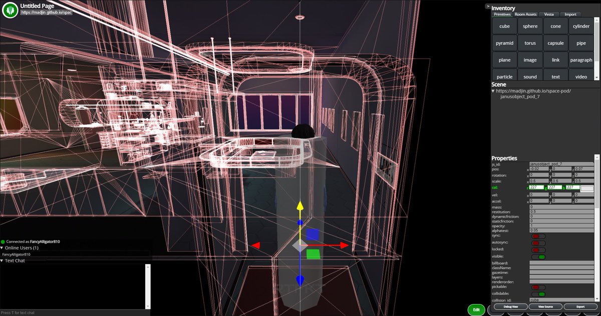 JanusWeb is perhaps the lightest weight Social XR framework made with three.js and elation engine. Custom worlds are static HTML files and the presence server is a very simple nodejs app that is easy to self-host. Itβs an OG project by M3 member @bai0 that is open source. You can view the demo here: https://pod.homespace.eth