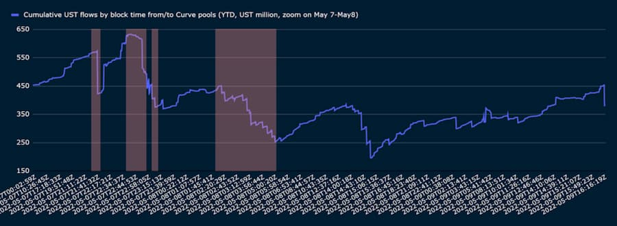 当检查 UST 流入和流出 Curve 池时,有两个时间段的情况非常突出(图 1)。2022 年 3 月和最近的 5 月 7 日至 5 月 11 日的时间段。我们特别关注 UST 的流入,因为 UST 脱锚据说是由于 UST 与其他稳定币的过度交换造成的,至少最初是这样。
