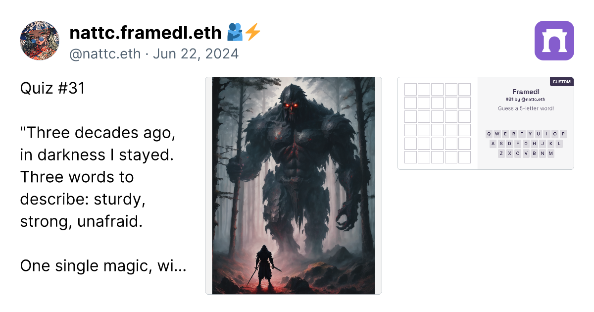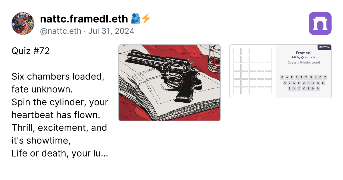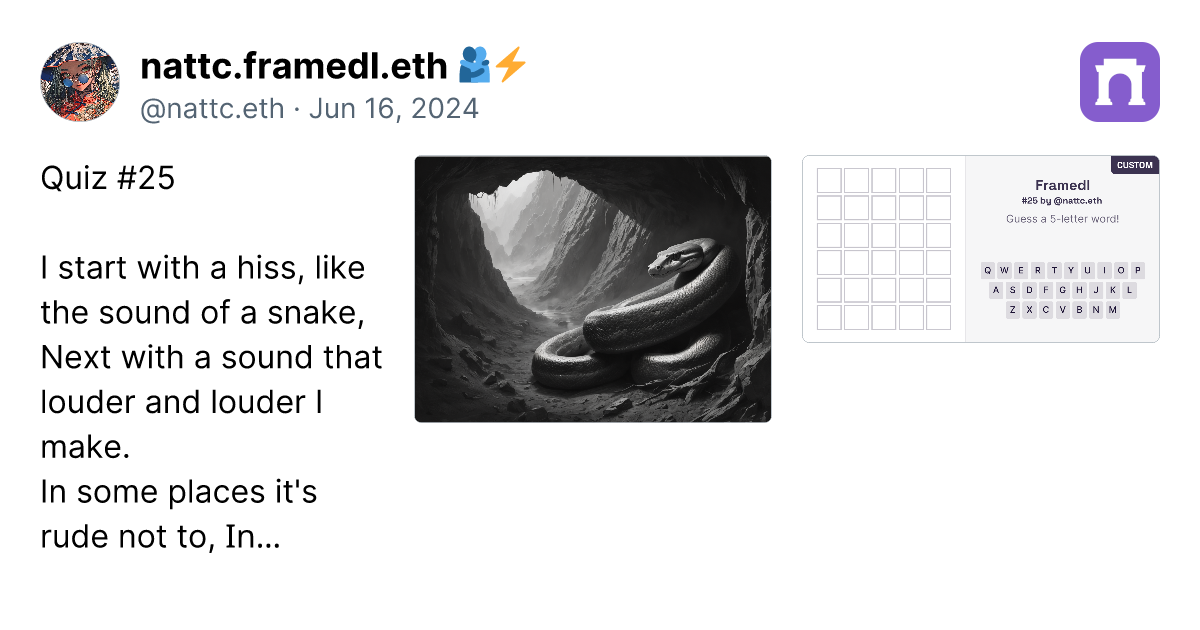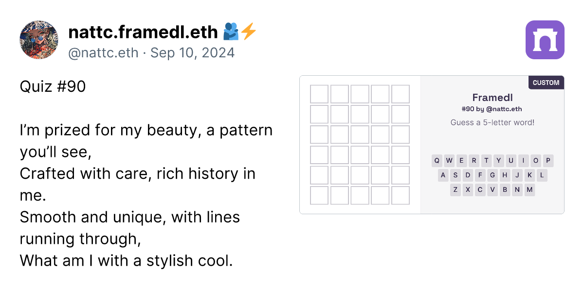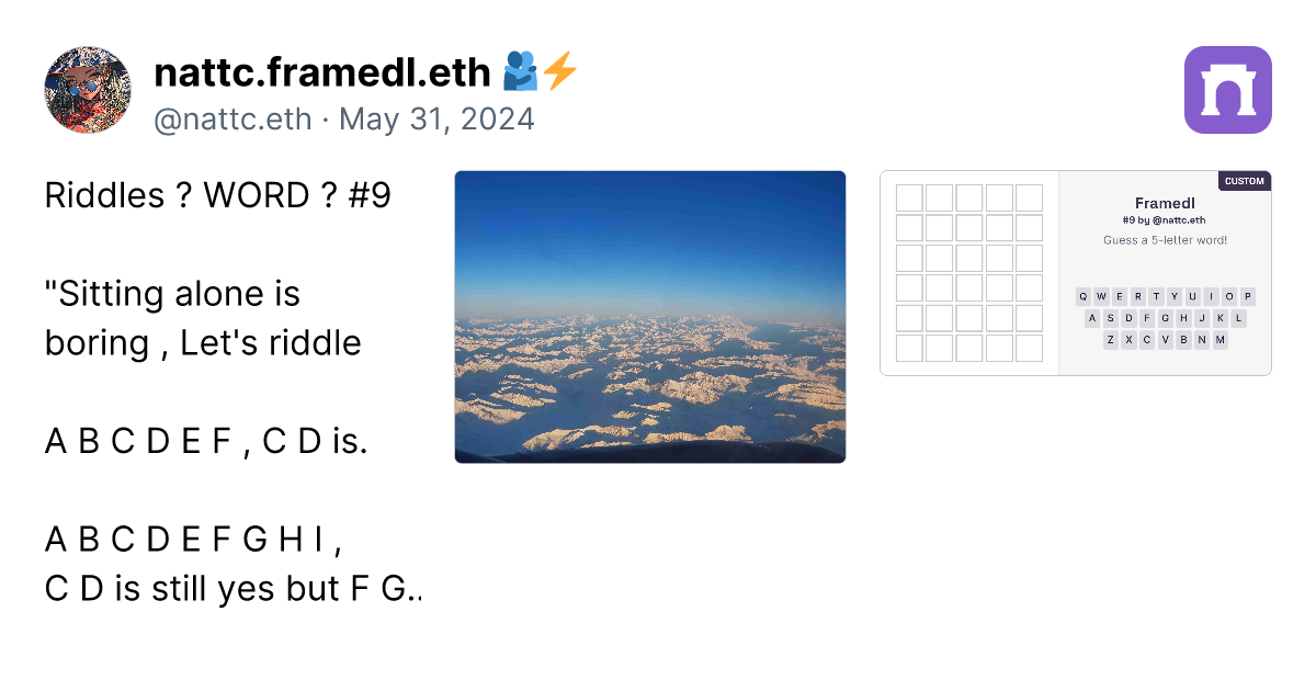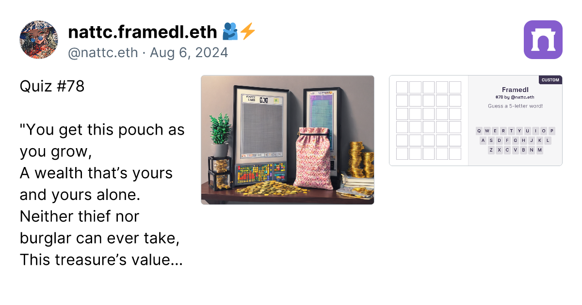 Alright, after creating 90 custom framedl works, I have to say that to create the ideas are getting more and more challenging. However, I have gathered the custom ones that I think are the best in this paragraph. Just click the link (it's a real link, not a scam), and you can go directly to the image of the framedl that interests you. It will link to that specific riddle. Honestly, I think all 90 pieces are great, and I will continue to create more. I might take a break on some days if I have no ideas. However, if you want to play all the games, you can click on my profile in the paragraph. I have collected them all in one place. https://paragraph.xyz/@nattc.eth/bestnattcriddles?referrer=0x05F761AacD63e4e96Bf98f0fE5614De5Ba90856C