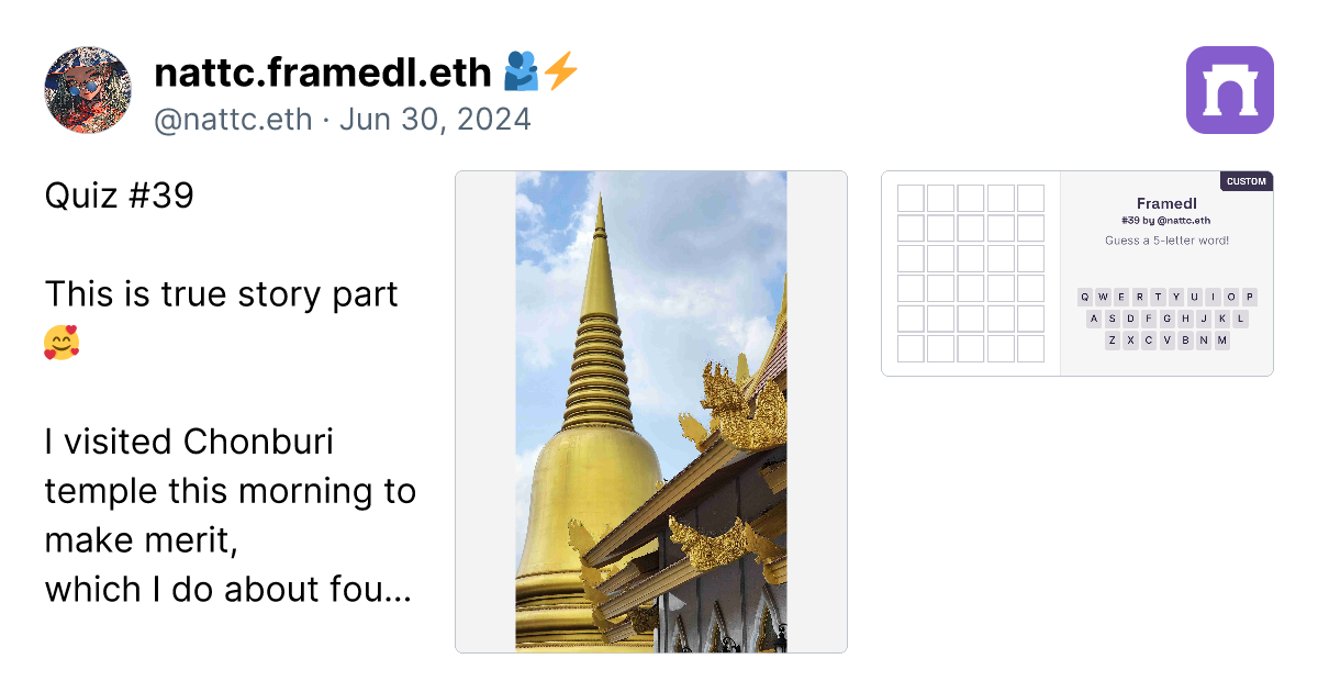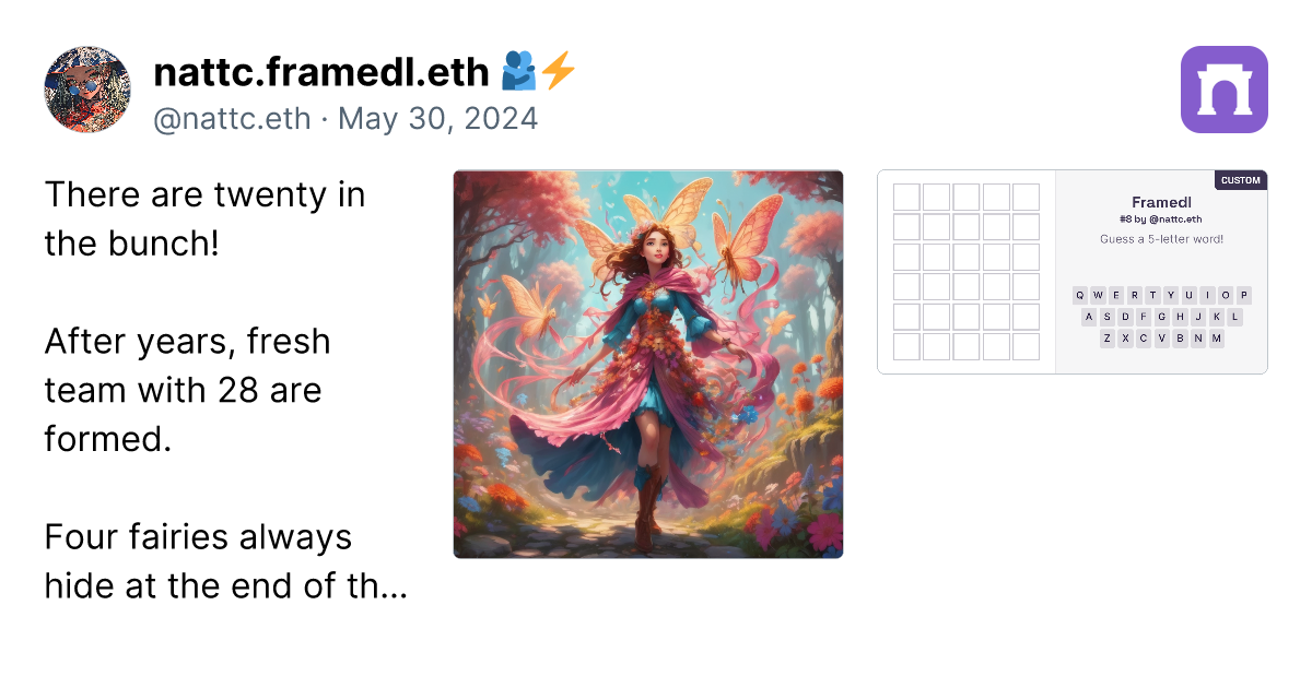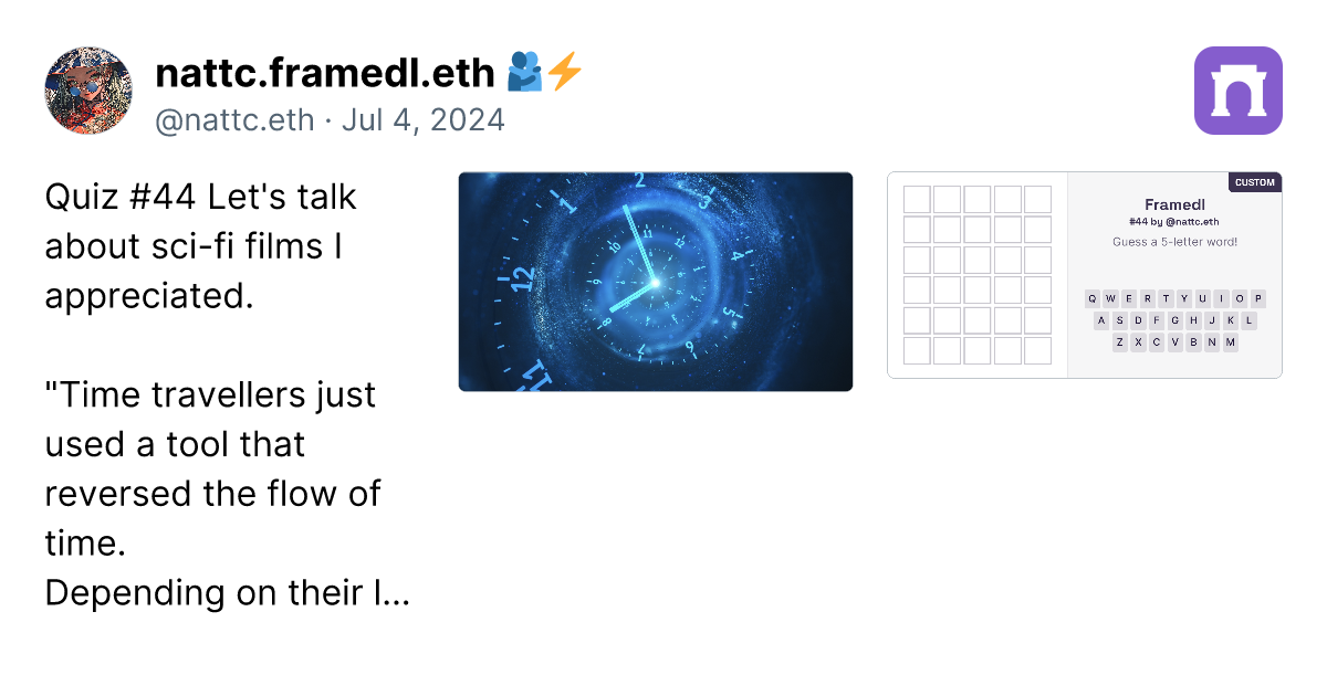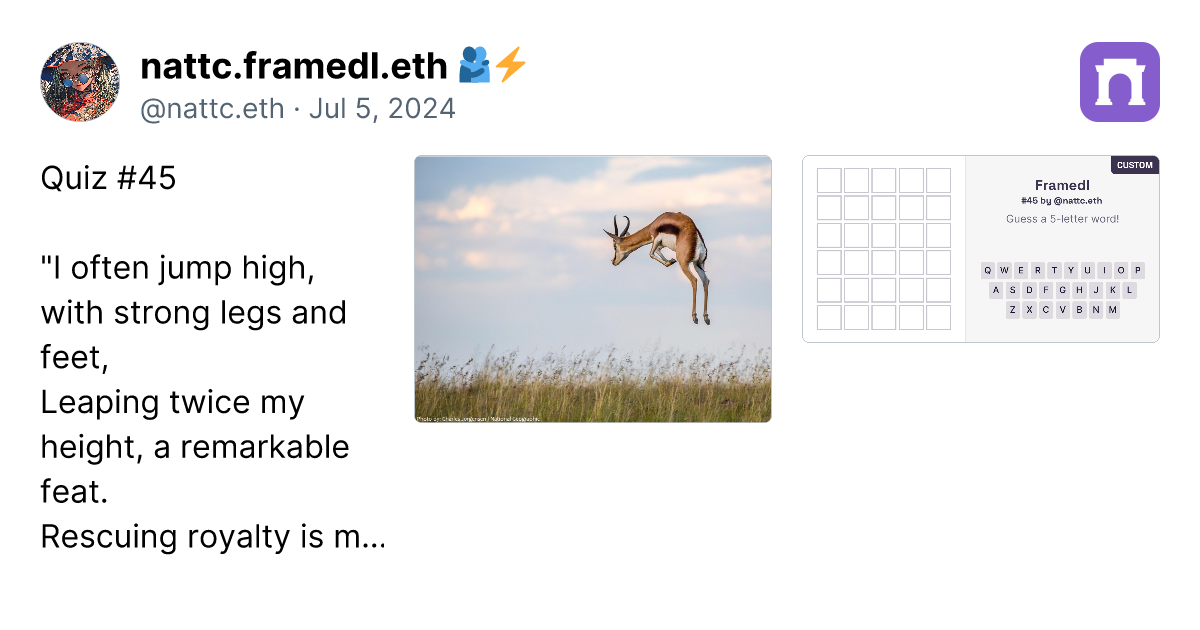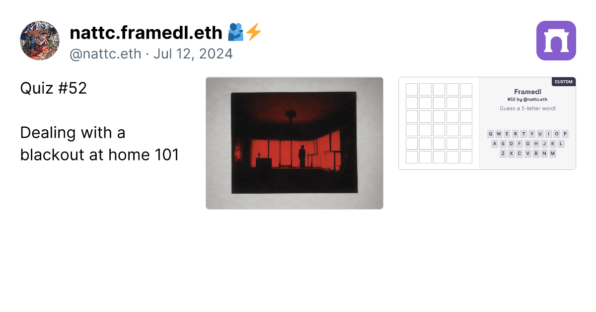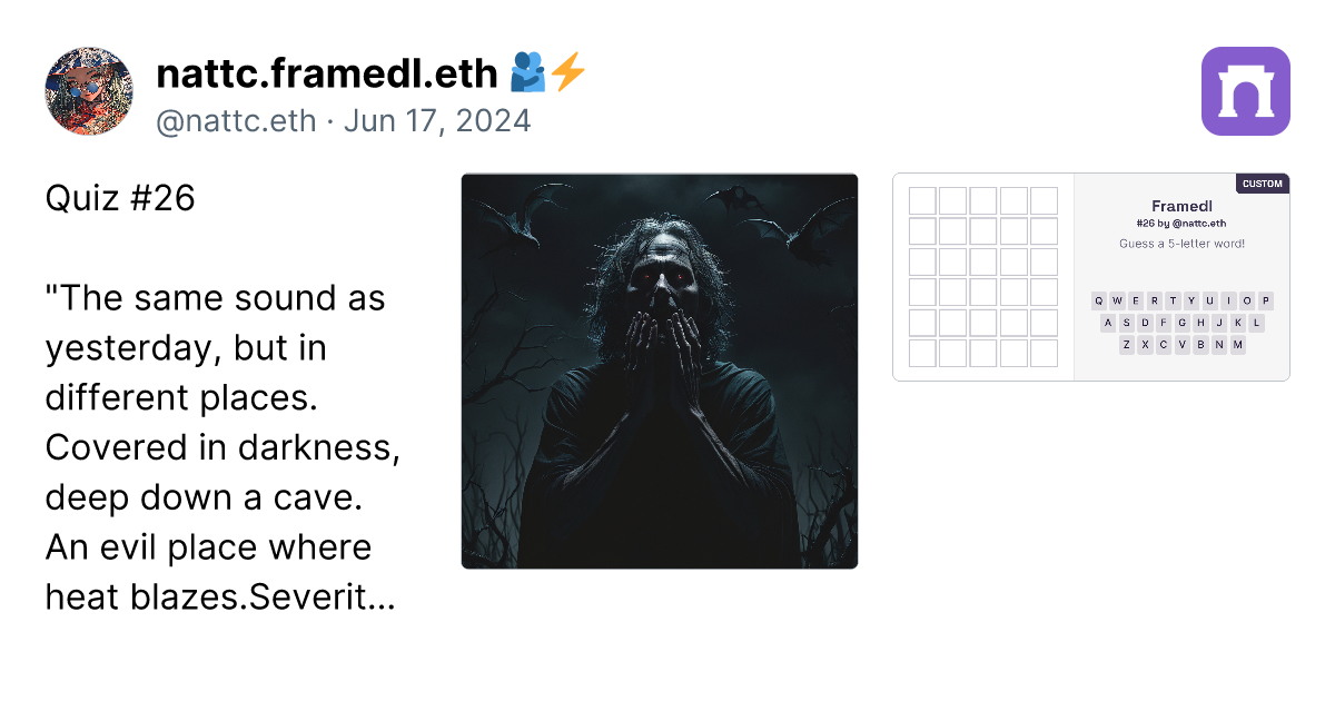 Alright, after creating 90 custom framedl works, I have to say that to create the ideas are getting more and more challenging. However, I have gathered the custom ones that I think are the best in this paragraph. Just click the link (it's a real link, not a scam), and you can go directly to the image of the framedl that interests you. It will link to that specific riddle. Honestly, I think all 90 pieces are great, and I will continue to create more. I might take a break on some days if I have no ideas. However, if you want to play all the games, you can click on my profile in the paragraph. I have collected them all in one place. https://paragraph.xyz/@nattc.eth/bestnattcriddles?referrer=0x05F761AacD63e4e96Bf98f0fE5614De5Ba90856C