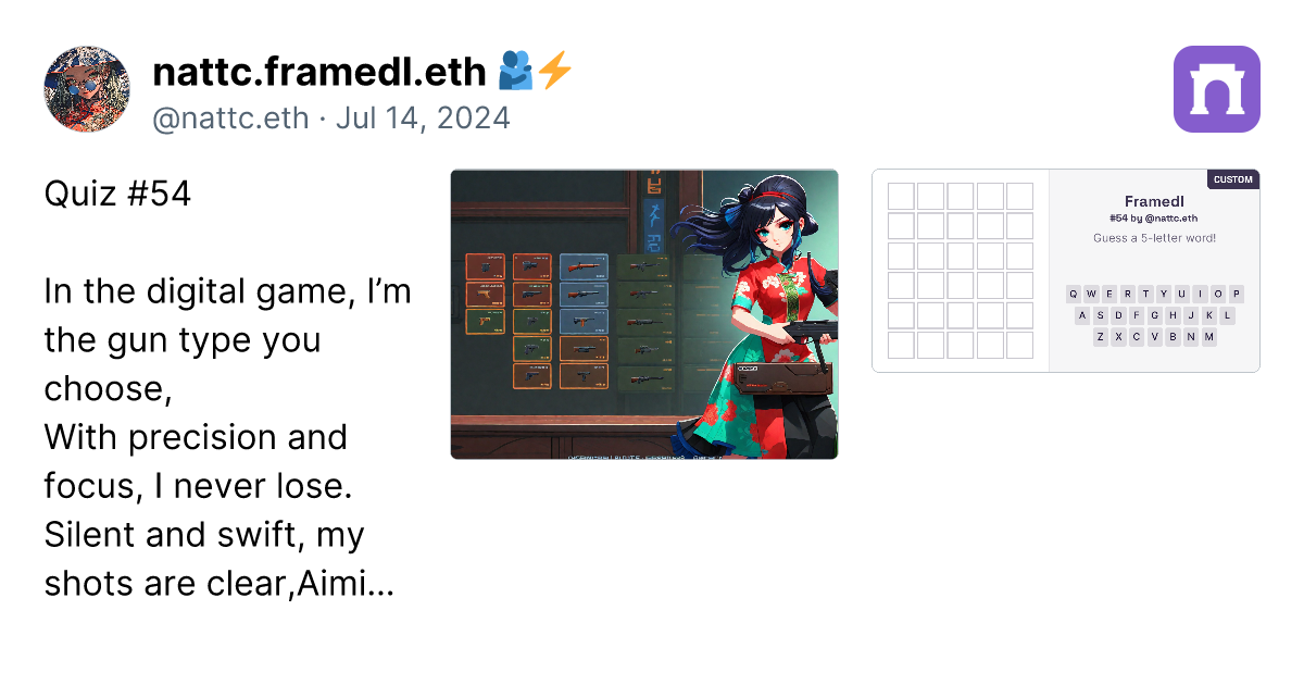 Quiz #54 In the digital game, I’m the gun type you choose, With precision and focus, I never lose. Silent and swift, my shots are clear, Aiming at targets both far and near. I come with settings for the perfect aim, Rapid fire or single, I play the game. I have tons of ammo, depends on the pockets, I lock onto subjects, as steady as can locked. In this FPS world, I'm your visual one. Ready, set, go, run and gun. Check the muzzle, and the trigger carefully, Or you'll miss the shot, quite regretfully. https://imagedelivery.net/BXluQx4ige9GuW0Ia56BHw/06fb3cec-0ead-4430-5b02-af98731b0f00/original https://framedl.xyz/?cw=5199afff-8e41-4e29-8f50-8b1f48668ba4