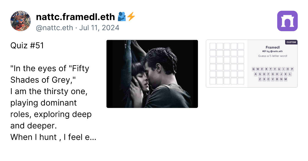 Quiz #51 "In the eyes of "Fifty Shades of Grey," I am the thirsty one, playing dominant roles, exploring deep and deeper. When I hunt , I feel every movement , every temper , sentimental. Eyes meet intensely, teeth poised, a kiss potent enough to captivate body and mind." What am I? https://imagedelivery.net/BXluQx4ige9GuW0Ia56BHw/efb70bbc-4cc8-43c6-e1a5-8c6f57484300/original https://framedl.xyz/?cw=76b912f7-5d09-4e35-9fe2-cd7766857121