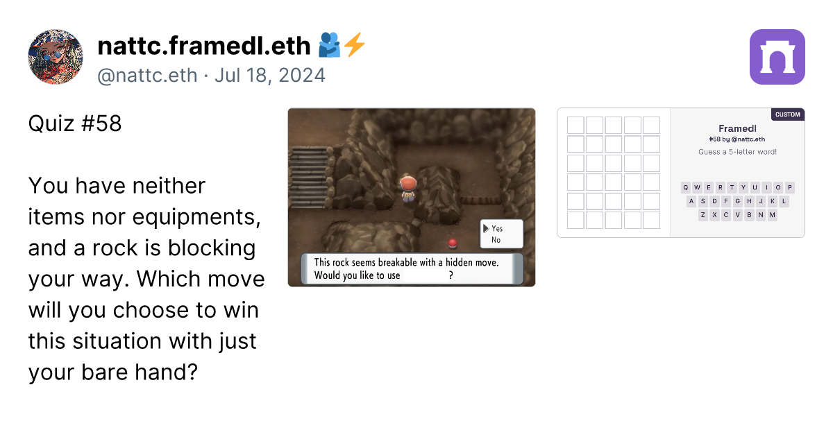 Quiz #58 You have neither items nor equipments, and a rock is blocking your way. Which move will you choose to win this situation with just your bare hand? https://imagedelivery.net/BXluQx4ige9GuW0Ia56BHw/3063bc4a-cfc4-4cfe-0061-40881ef91d00/original https://framedl.xyz/?cw=f4db5271-c82e-450c-bcaf-d56745e6ff6e