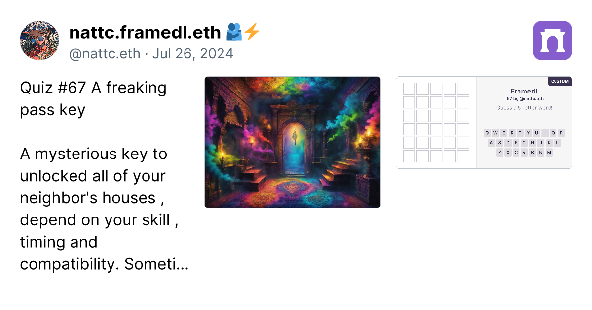 Quiz #67 A freaking pass key A mysterious key to unlocked all of your neighbor's houses , depend on your skill , timing and compatibility. Sometimes it unlocks instantly with a single click. https://imagedelivery.net/BXluQx4ige9GuW0Ia56BHw/5fa710f3-34d7-4e78-302e-1eba3b62a400/original https://framedl.xyz/?cw=2e5962ea-045e-491e-b6e1-8a57dda8f07e