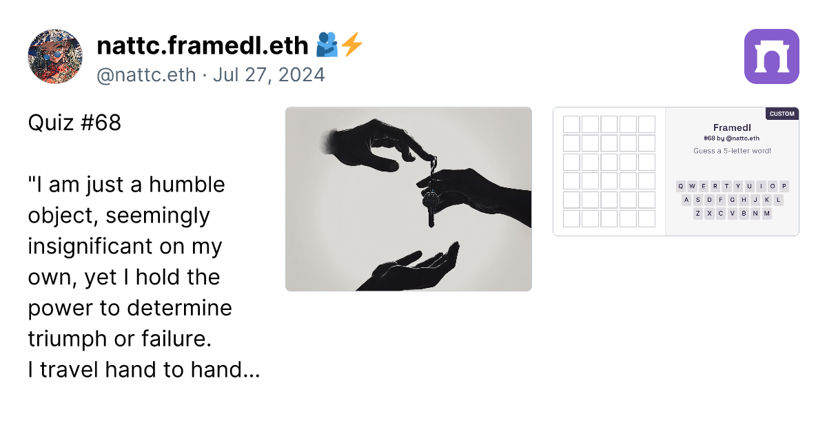 Quiz #68 "I am just a humble object, seemingly insignificant on my own, yet I hold the power to determine triumph or failure. I travel hand to hand, a silent witness to the efforts of many. Without me, continuity is broken, yet I am neither the beginning nor the end. What am I?" Today, I am very busy as usual. Saturday is a holiday for others, but a tiring day for dentist.🥲 https://imagedelivery.net/BXluQx4ige9GuW0Ia56BHw/6d63a4ae-1a0d-4b14-6c2f-ad96c289b000/original https://framedl.xyz/?cw=2f85e3a9-9a08-4ccf-862e-55274aa0ef79