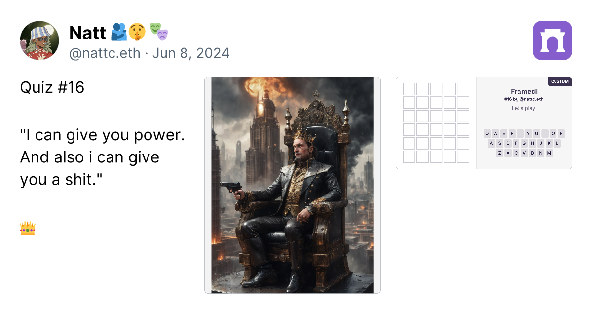 Quiz #16 "I can give you power. And also i can give you a shit." π https://imagedelivery.net/BXluQx4ige9GuW0Ia56BHw/c8ebd65e-3425-4f4f-8aab-99b2a7f73c00/original https://framedl.xyz/?cw=76e65272-6222-426c-b605-8208ef59a2c0