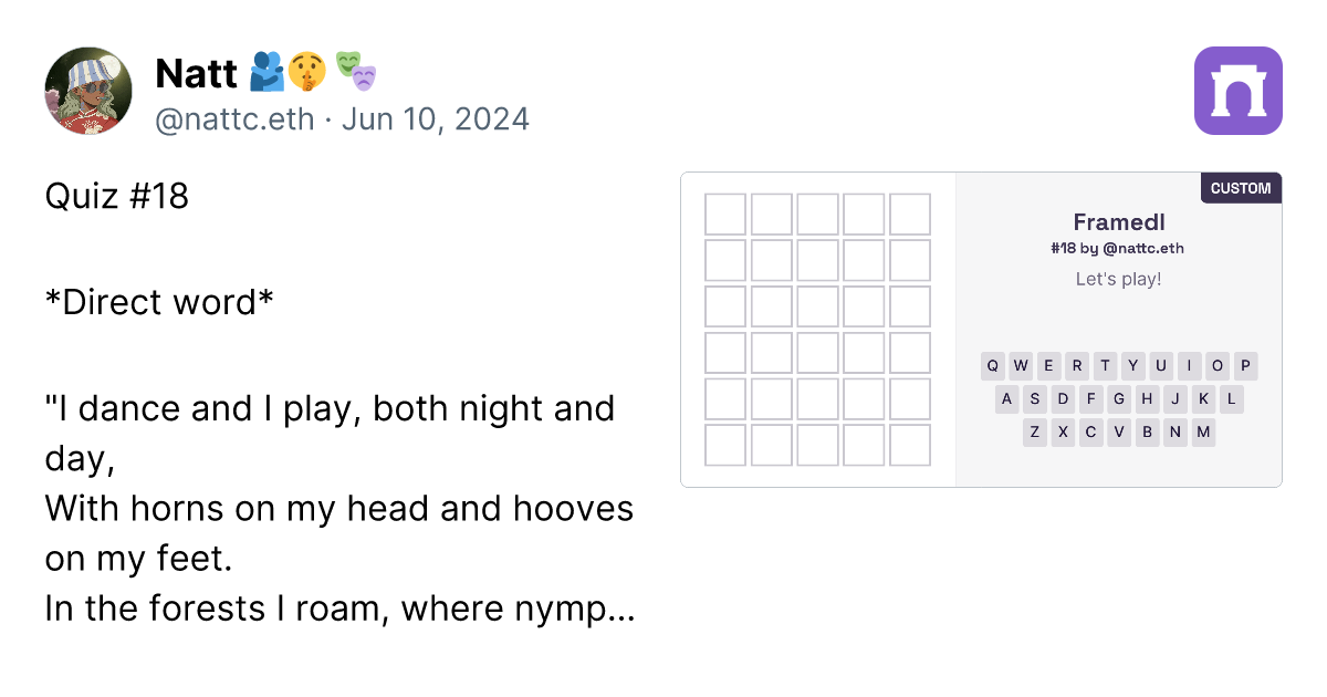 Quiz #18 *Direct word* "I dance and I play, both night and day, With horns on my head and hooves on my feet. In the forests I roam, where nymphs call home, Who am I, so wild and free?" Some of you maybe never knew this word ,so feel free to know nowπ https://framedl.xyz/?cw=3019d314-6709-42e3-9238-8ab9eb9a36ff