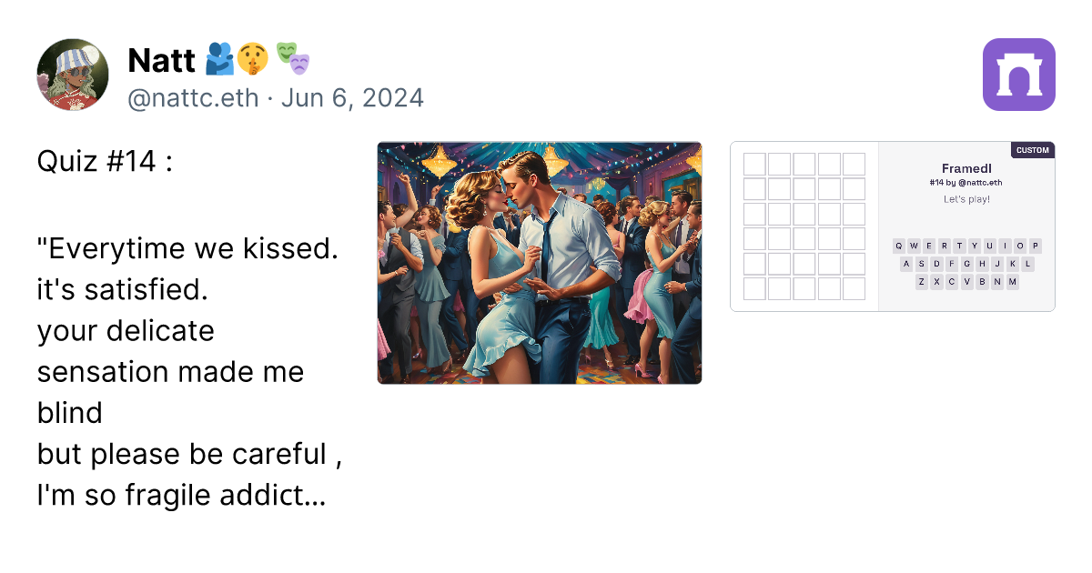 Quiz #14 : "Everytime we kissed. it's satisfied. your delicate sensation made me blind but please be careful , I'm so fragile addicted to you. I feel butterflies." I have only 5 degen to least attempts , few prize but to have more fun, right? https://imagedelivery.net/BXluQx4ige9GuW0Ia56BHw/5df430c3-a0c4-4e64-1057-3286f14abe00/original https://framedl.xyz/?cw=ee066534-4763-4b01-b9de-d9a0720e1dbf