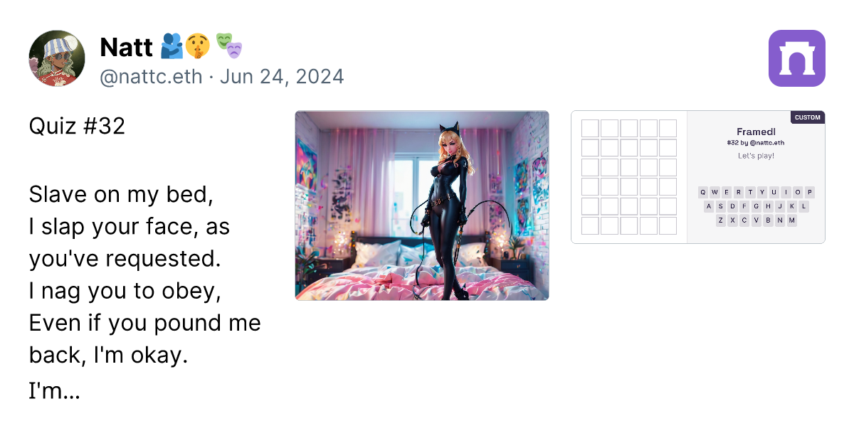 Quiz #32 Slave on my bed, I slap your face, as you've requested. I nag you to obey, Even if you pound me back, I'm okay. I'm hot and electrified, I yell until you've cried. A cosplayer with a whip, Ahhh, so satisfied. ๐ How maso you are ๐, What am I? https://imagedelivery.net/BXluQx4ige9GuW0Ia56BHw/af9cf1ef-d126-4d5b-f4c4-b1c4454ef900/original https://framedl.xyz/?cw=aa27bb00-e805-44d6-9d78-874667ec0f80