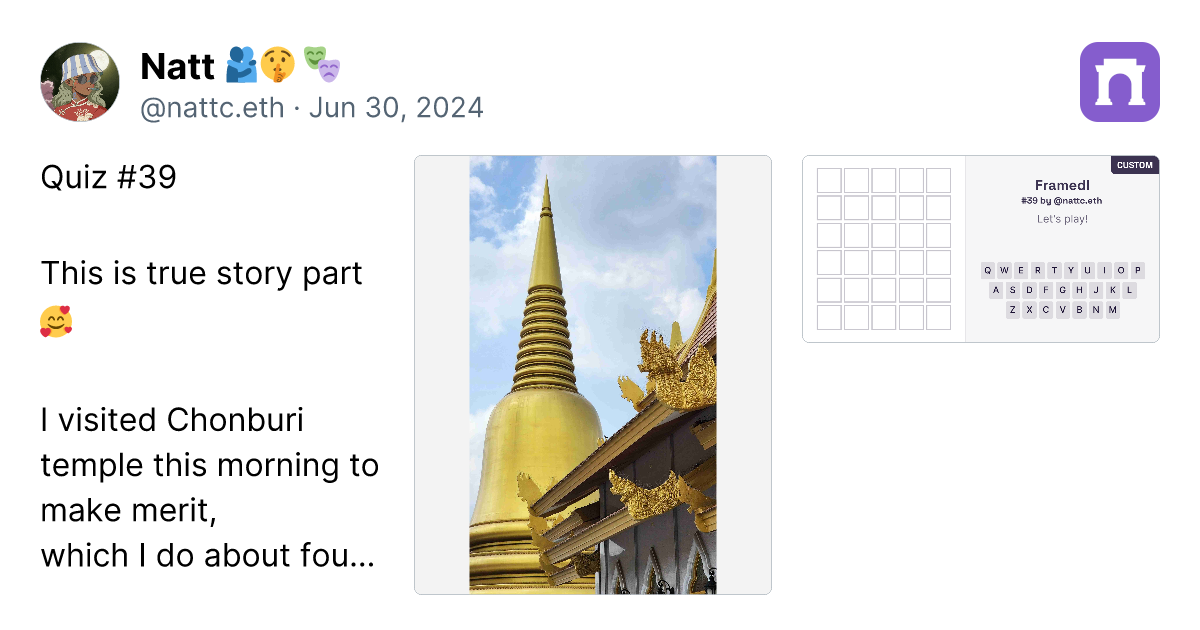 Quiz #39 This is true story part ๐ฅฐ I visited Chonburi temple this morning to make merit, which I do about four times a year. I wish to share this merit with all of you, hoping it brings you blessings and positivity. The question is why you all should get blessed ? https://imagedelivery.net/BXluQx4ige9GuW0Ia56BHw/868b3c65-3f50-4c68-a3e3-793123a15d00/original https://framedl.xyz/?cw=bad7eed8-ae2f-424b-b9c2-cc005964563c
