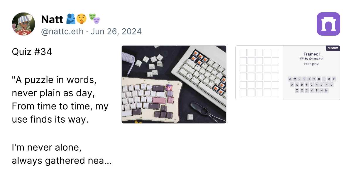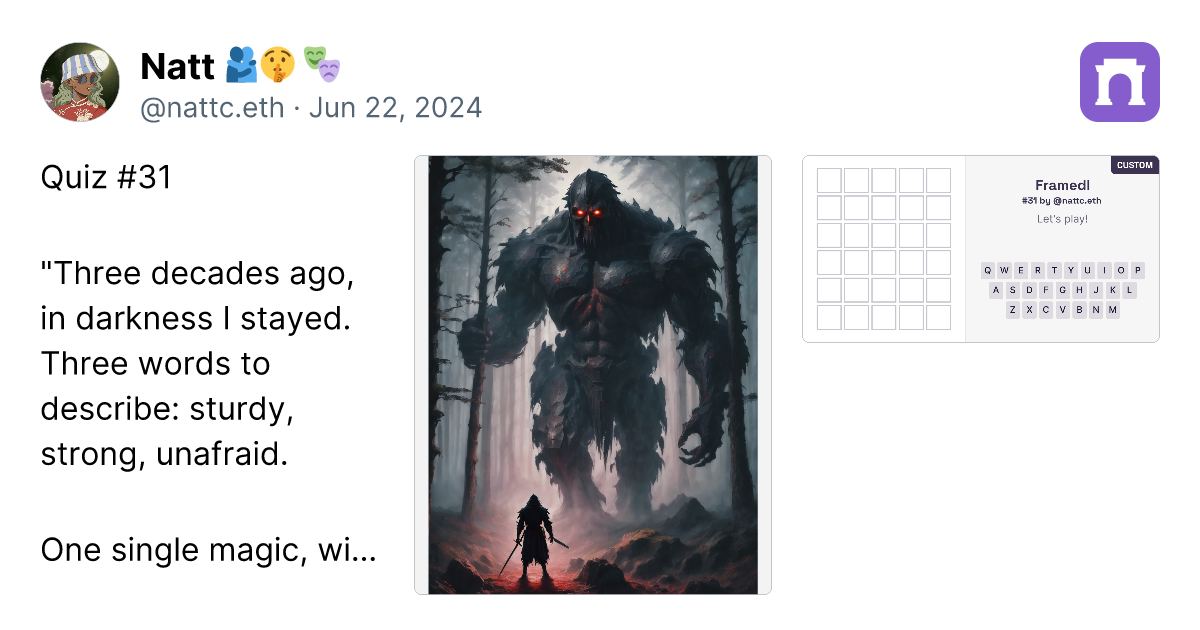I organized all my riddles in one piece. Easy to explore Collection Riddles 31 - 40 https://paragraph.xyz/@nattc.eth/nattcriddles31-40?referrer=0x05F761AacD63e4e96Bf98f0fE5614De5Ba90856C Collection Riddles 41 - 50 https://paragraph.xyz/@nattc.eth/nattcriddles41-50?referrer=0x05F761AacD63e4e96Bf98f0fE5614De5Ba90856C And again you have to access in the paragraph.xyz cause Read inline isn't work on farcaster links in it.