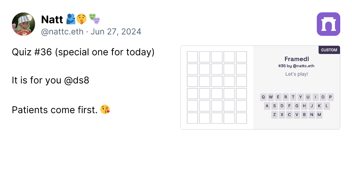 Quiz #36 (special one for today) It is for you @ds8 Patients come first. ๐ https://framedl.xyz/?cw=86854820-1b5f-469f-9382-4230fa2da5e8