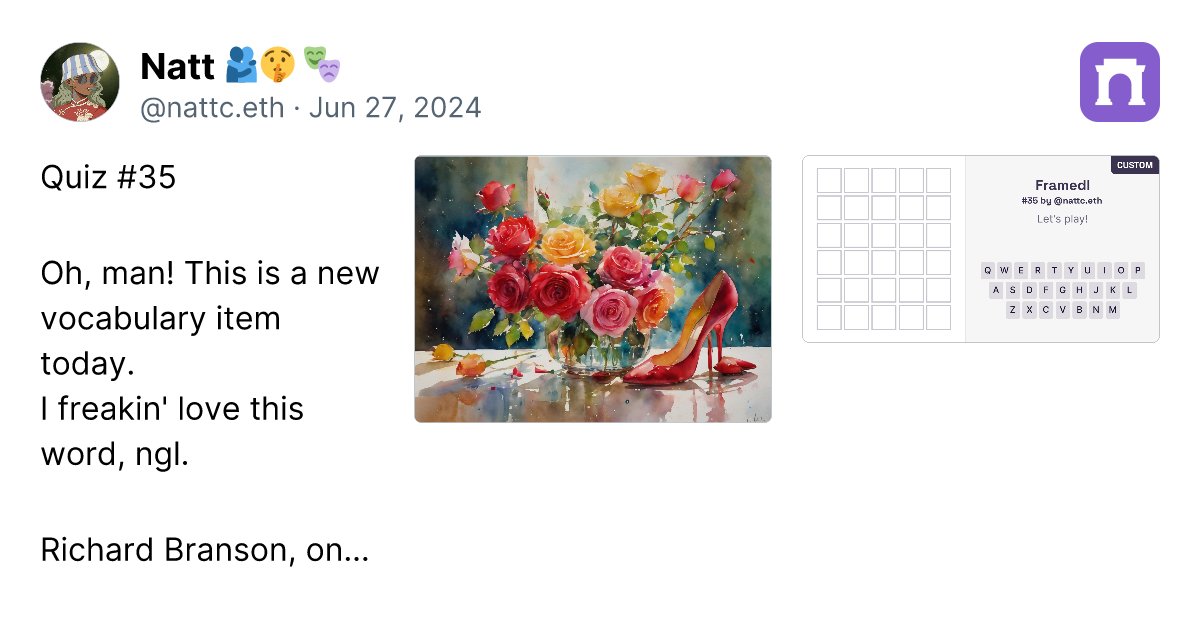 Quiz #35 Oh, man! This is a new vocabulary item today. I freakin' love this word, ngl. Richard Branson, once said that flowers flourish on water, people fluorish on praise. I am overjoyed and fulfilled by this word. So we're not gonna have riddles today. But once you finish the term. That's the word to you. ๐น https://imagedelivery.net/BXluQx4ige9GuW0Ia56BHw/3b204f81-9af7-4801-23b2-cc8147d3df00/original https://framedl.xyz/?cw=f6016bee-c280-48d6-b395-6c1f2ad4be94