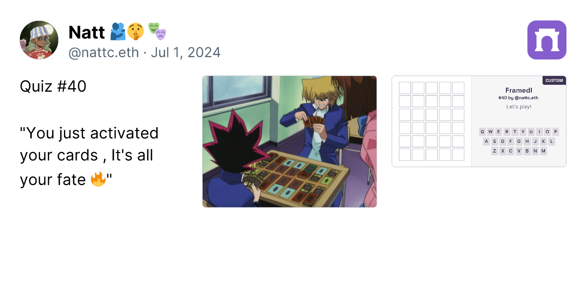 Quiz #40 "You just activated your cards , It's all your fate ๐ฅ" https://imagedelivery.net/BXluQx4ige9GuW0Ia56BHw/6344abb1-2c6f-4ae3-654b-f524b3915c00/original https://framedl.xyz/?cw=0216ab7a-46fa-4f49-a37a-e93e7aad1228