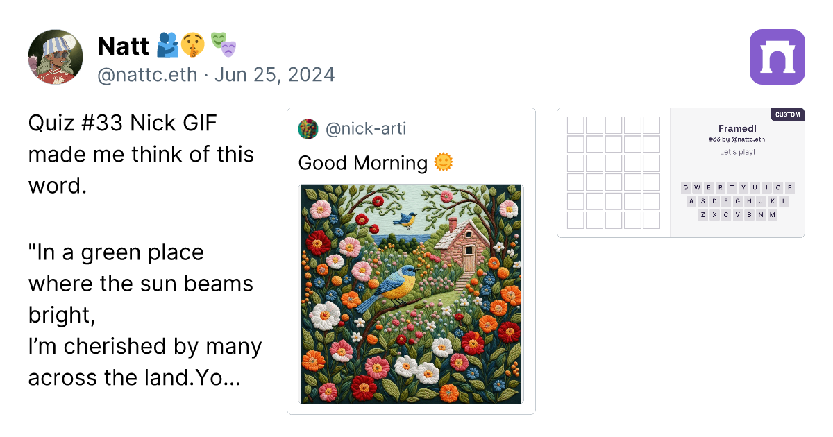 Quiz #33 Nick GIF made me think of this word. "In a green place where the sun beams bright, Iโm cherished by many across the land. You might find me in a garden, where peace is planned, Or where the winds whisper and the warm sands stand. I bring calm and rest to those who toil, Yet some feel my touch and senses recoil. Mystery, both loved and banned, A paradox held in natureโs hand." https://warpcast.com/nick-arti/0xf907ab46 https://framedl.xyz/?cw=fcd6fe74-ba44-4cd1-8fc0-c9e09e2b0b89