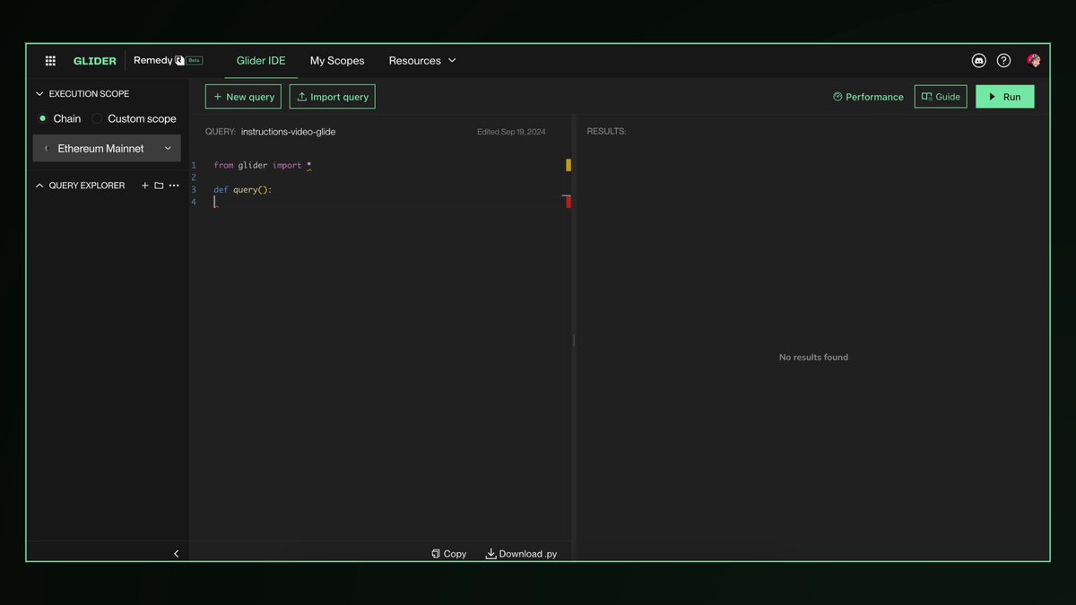 Glider IDE provides users several key features that include an embedded editor to write Glides, the ability to run Glides against EVM chains, and view Glider documentation.