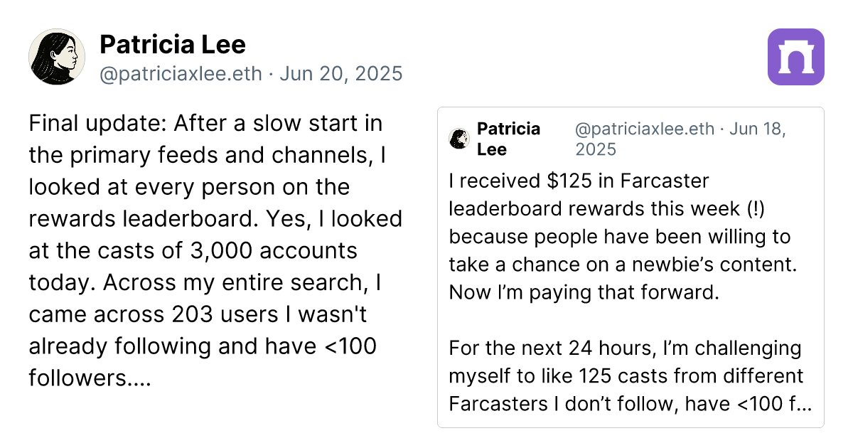 Patricia is one of the winners of farcaster rewards leaderboard. She did something amazing that I truly respect. She went on a tryst to find 125 casts by people she didn't follow and had less than 100 followers.