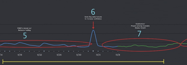 上图所示的曲线图,就是我们想讨论的NFT大部分项目经历的价格走势。在接下来的段落中,我会分阶段来解释。