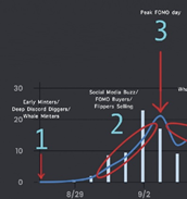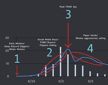 当“每个人”都在谈论这件事时,一点势头就可以变成了巨大的FOMO(Fear Of Missing Out)。新想法,新项目,似乎很成功了?其实在这个阶段说还为时过早。这个时候部分炒客/巨鲸/早期投资者会选择卖出,但因为买家数量在增加,所以价格继续上涨。
