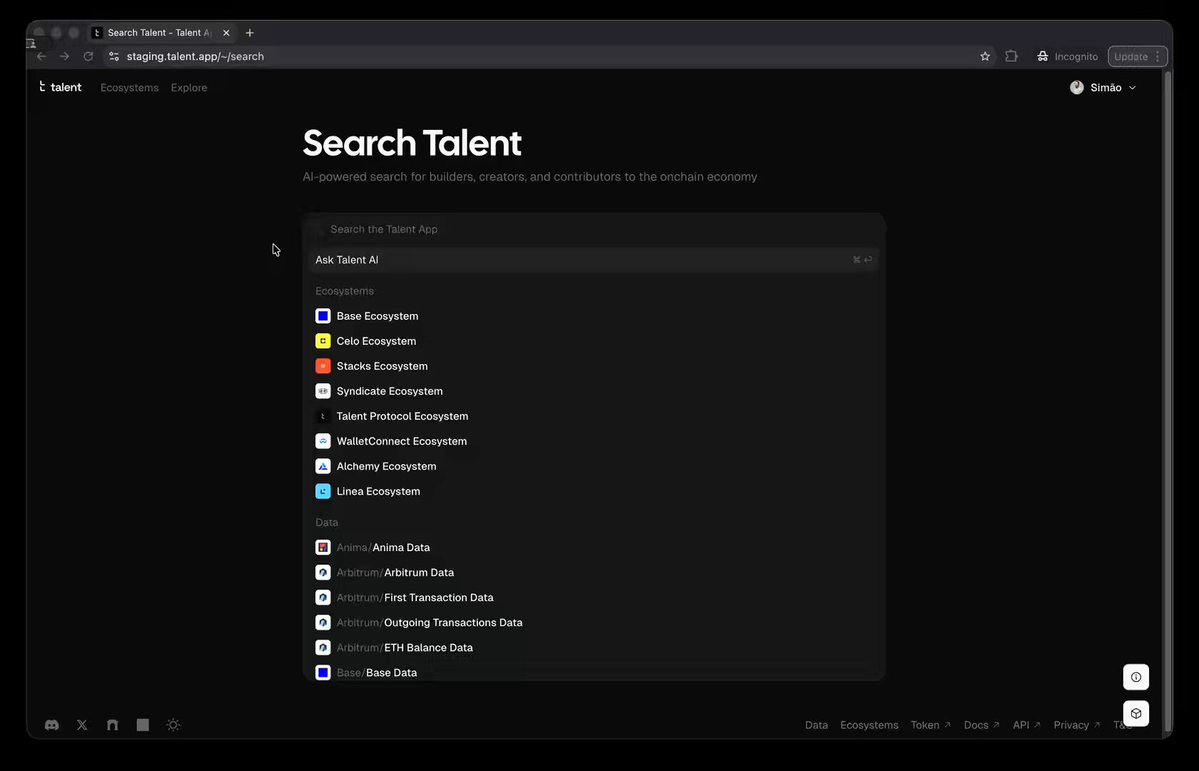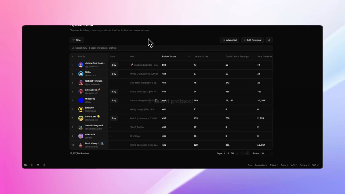 Talent App is our interface on top of the protocol. Builders showcase verified activity. Ecosystems run growth campaigns to reward their top contributors. Leaderboards surface who's shipping the most. Project pages give context to what builders are working on. And search tools let anyone find proven builders filtered by skills, activity, and reputation.