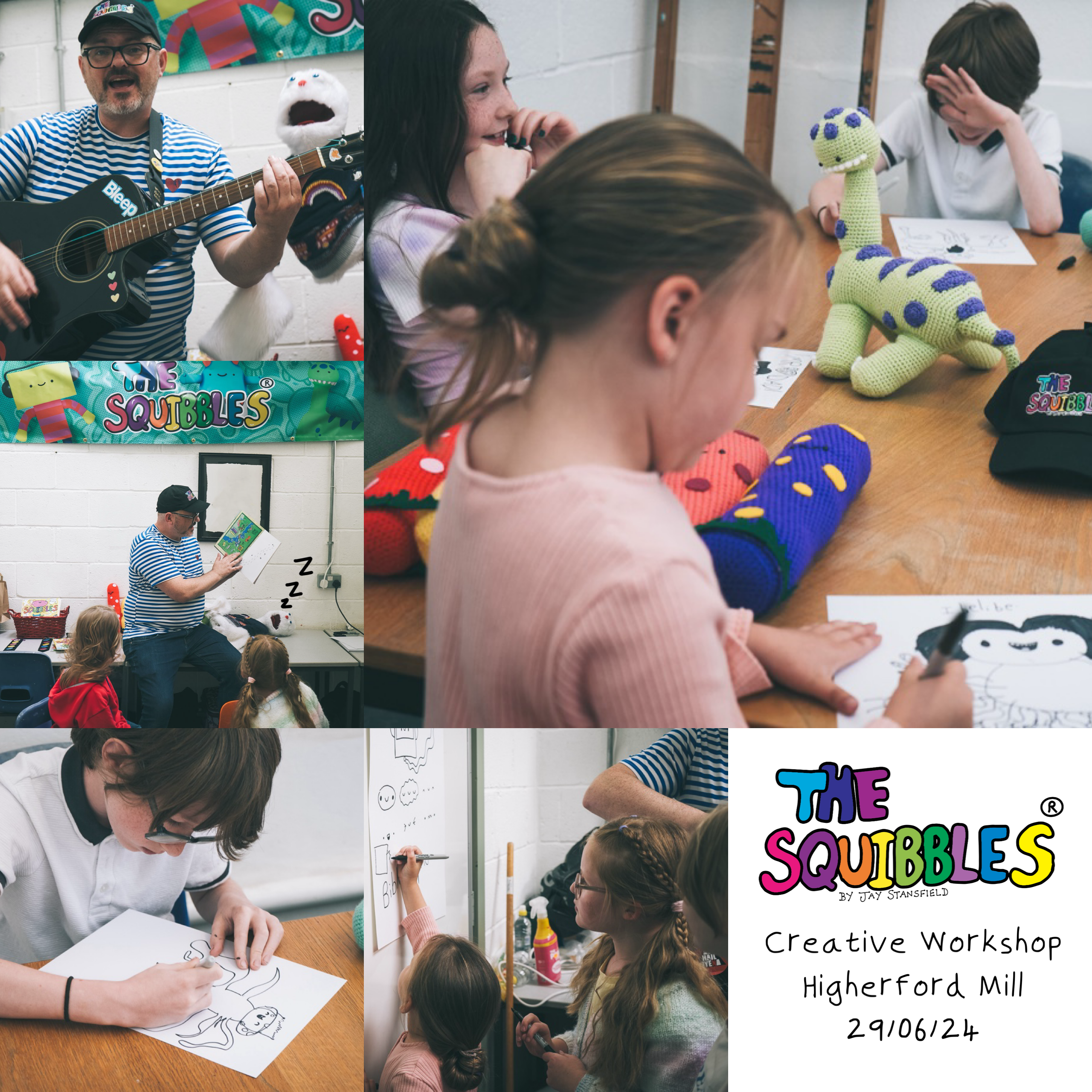 Our very own Squibbles®️ creator Jay held a creative workshop recently at Higherford Mill in Barrowford, Lancashire, and it was a huge success. The children listened to Meet The Squibbles, met the characters in the book, snuggled some crocheted characters, created a Squibble together, learned some tricks on how to draw their own Squibbles, made up some songs about them, and they also met Frederick The Third!
