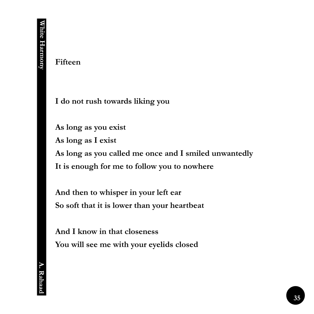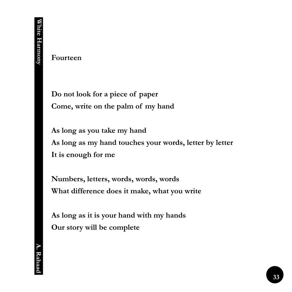 White Harmony / Fourteen © ------------------------------ Original Persian Poem: چهارده دنبال کاغذ نگرد بیا، کف دست من بنویس همین که دستم را بگیری همین که دستم حرف حرف کلماتت را لمس کند برای من کافی است اعداد، حروف، واژهها، واژهها، واژها چه فرقی دارد چه مینویسی همین که دست تو باشد، با دستانم داستان