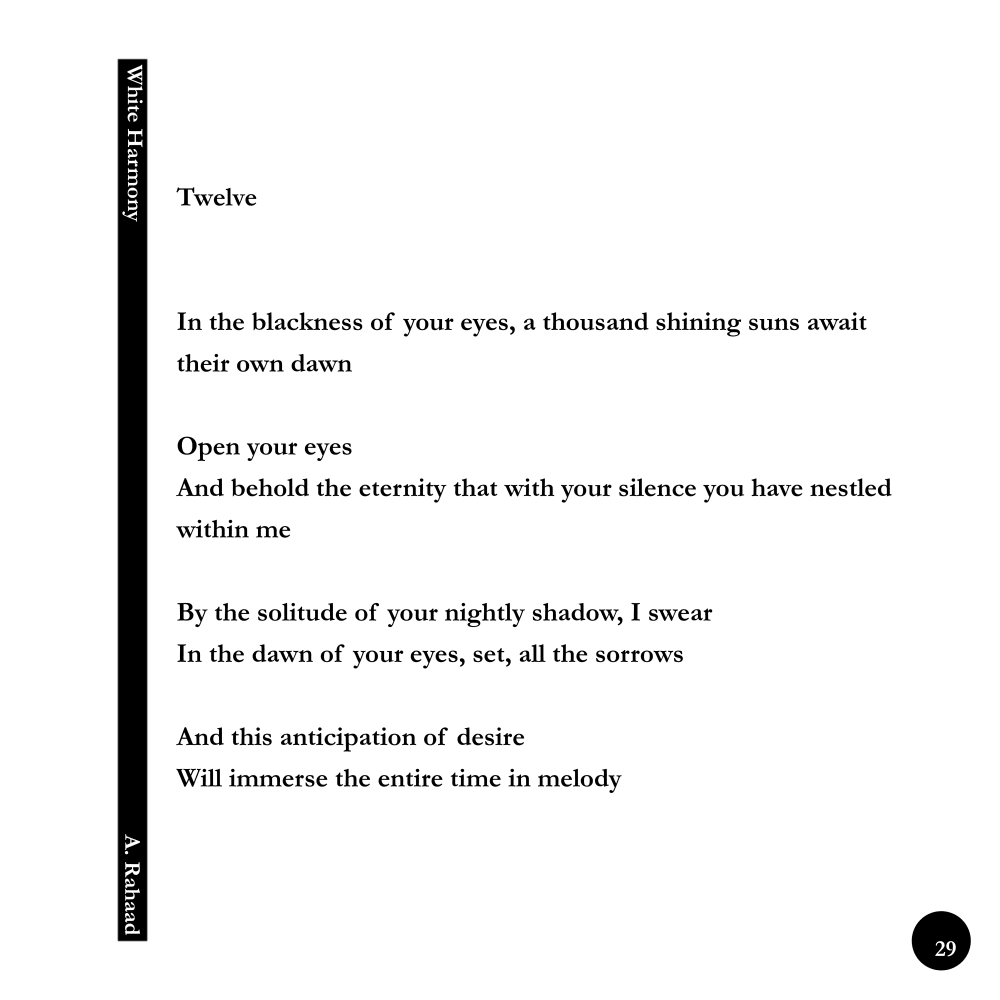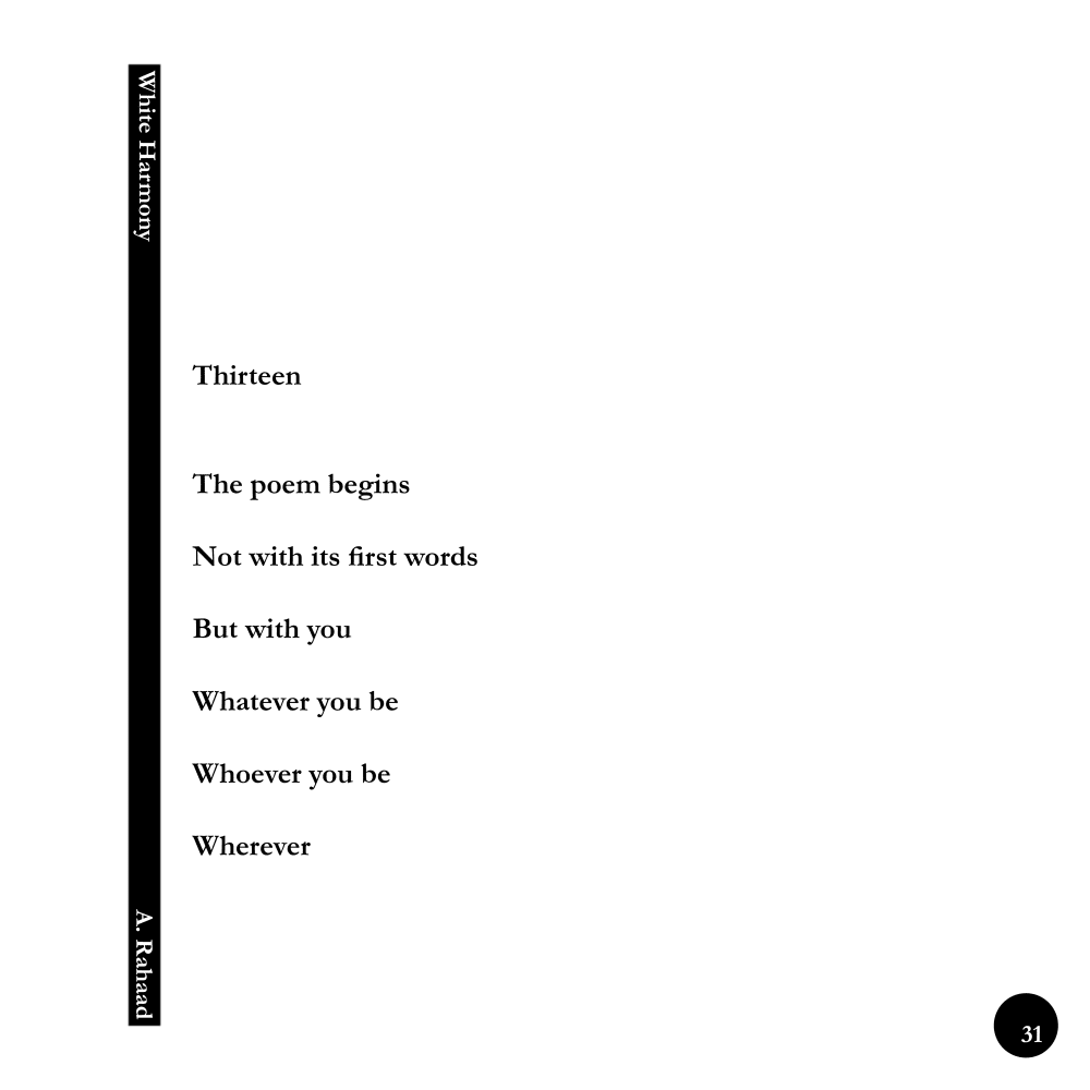 White Harmony / Thirteen © ------------------------------ Original Persian Poem: سیزده شعر آغاز میشود نه از اولین واژگانش که از تو هر چه باشی هر که باشی هر کجا --------------------------------- English Version of Poem: Thirteen The poem begins Not with its first words But with you Whatever you be Whoever you be Wherever ------------------------ Poem's Title: Thirteen Book's Title: White Harmony (Persian Title: Harmoniye Sepid) Author/ Poetry and Photography: A.