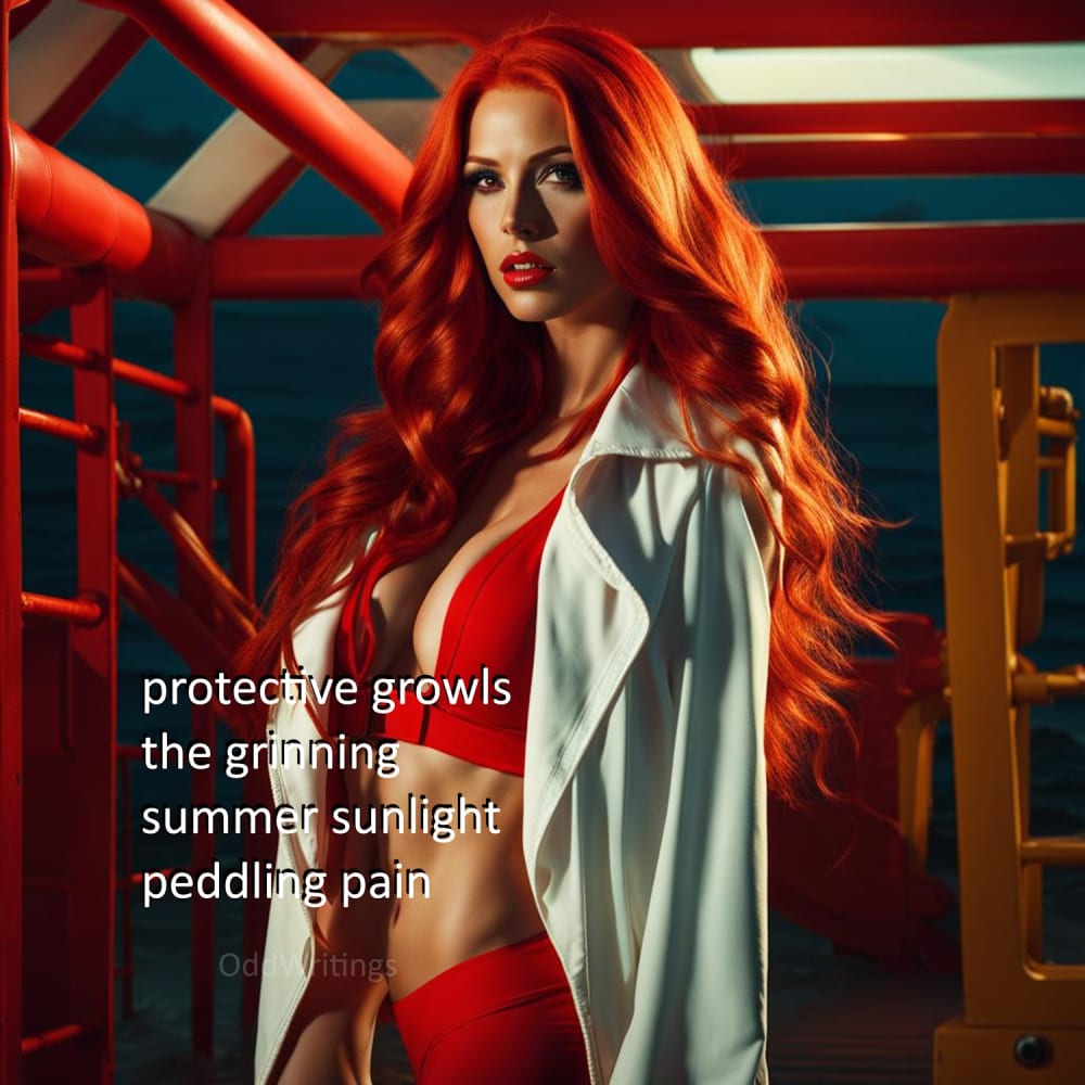 BF Kamila This graphic is of a lifeguard away from the beach, with a poem. The poem is an experiment with mixed meter in four lines. series BF "grinning summer" It will appear in my book "Digital Friends 1" with QR codes that link back to primary and secondary markets: https://www.amazon.com/dp/B0CW1FSVBC.