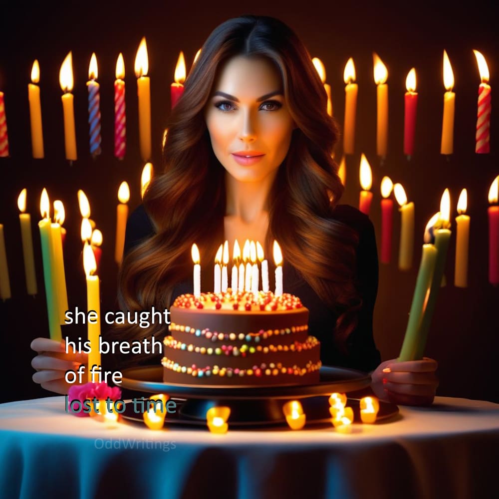 BF Layla This graphic is of a woman with a birthday cake, with a poem. The poem is an experiment with mixed meter in four lines. series BF "lost to time" It will appear in my book "Digital Friends 1" with QR codes that link back to primary and secondary markets: https://www.amazon.com/dp/B0CW1FSVBC.