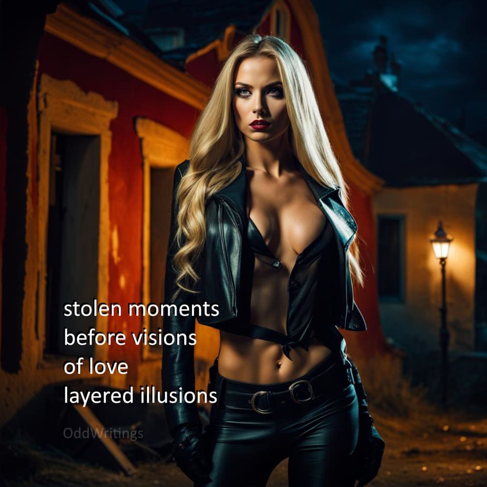 BF Armani This graphic is of a female thief, with a poem. experiment with mixed meter four lines series BF "stolen moments" It will appear in my book "Digital Friends 1" with QR codes that link back to primary and secondary markets: https://www.amazon.com/dp/B0CW1FSVBC. Provenance : http://oddwritings.com/digital_friends/armani.htm