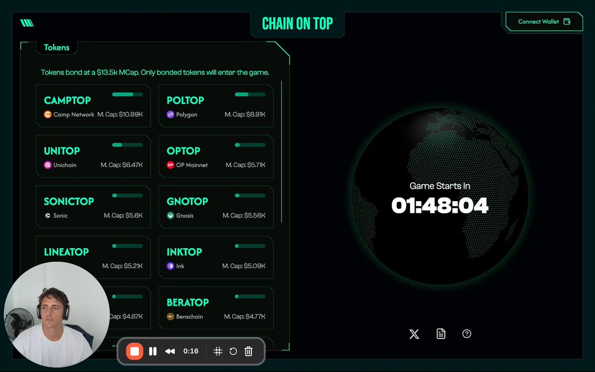 Comme sur le token launcher Pump.fun, les tokens représentants différentes blockchain doivent cumuler une certaine liquidité pour passer à l’échelle et entrer dans le jeu. Chaque blockchain est représentée par un token, $ETHTOP pour les partisans d’$ETH, dans lequel peuvent investir les joueurs en échangeant de l’$USDC.