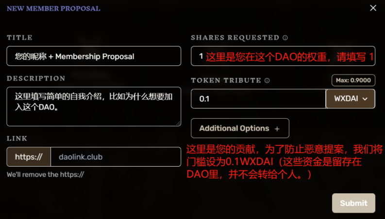 Token Tribute:0.1 WXDAI (只是防止恶意提案设置的门槛,资金留存在 DAO 中,不会消失,其他成员怒退也只能按照自己的份额拿回一部分资金,如您没有WXDAI,请先去 WrapETH 兑换;请勿乱填任何信息,特别是 SHARES REQUESTED ,否则您会失去这 0.1 WXDAI)